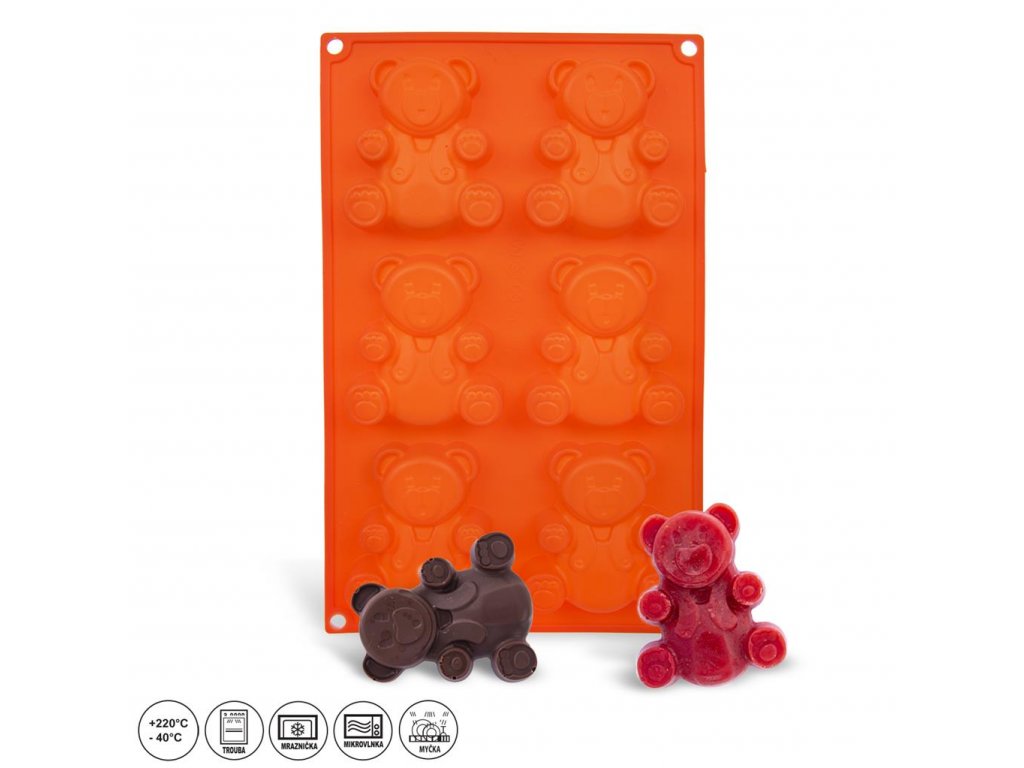 Silikonová forma na 6 medvídků. Je možné v ní péct v jakékoliv troubě nebo v ní připravit zpražené dezerty.