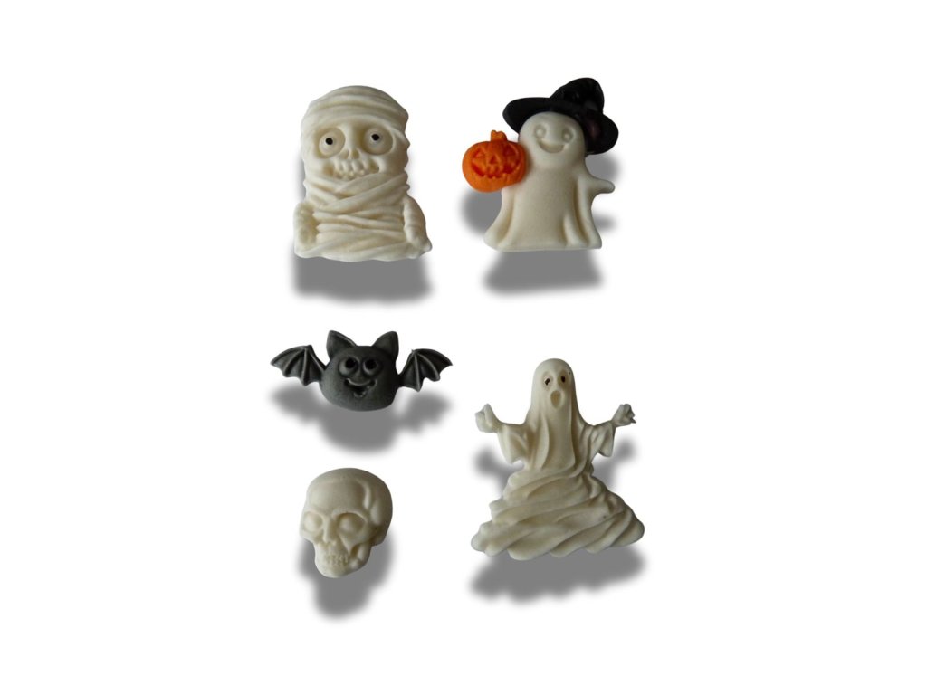 Velikost motivů: mumie - 43x33mm, duch s dýní - 42x37mm, duch - 48x41mm, netopýr - 43x18mm, lebka - 25x21mm