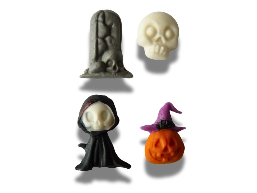 Velikost motivů: lebka - 27x23mm, duch - 39x30mm, dýně - 33x26mm, náhrobek - 37x31mm