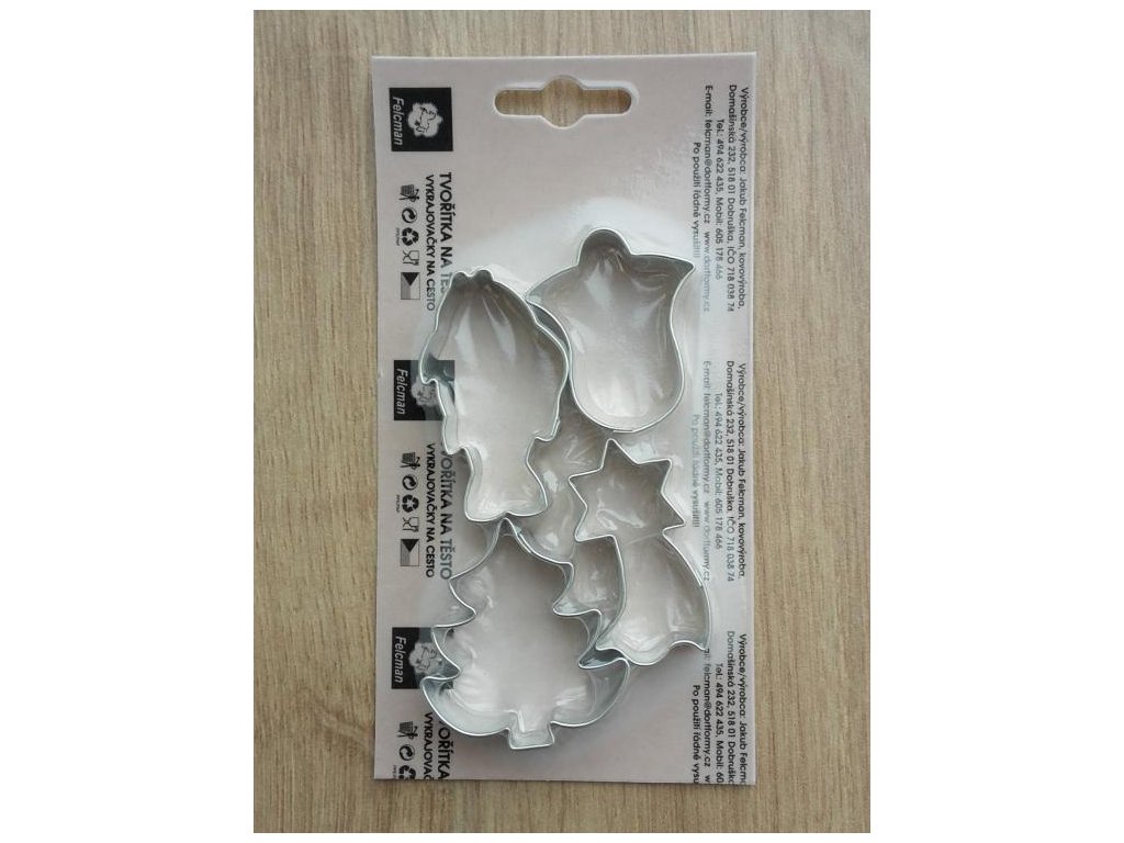 Sada čtyř kusů vánočních vykrajovátek z pocínovaného plechu ve tvaru ryby, stromečku, komety a zvonečku.