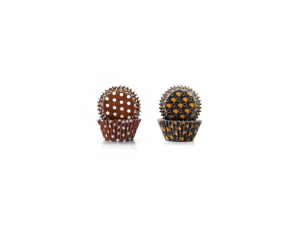 Papírové košíčky na pralinky s motivem srdíček a puntíků.