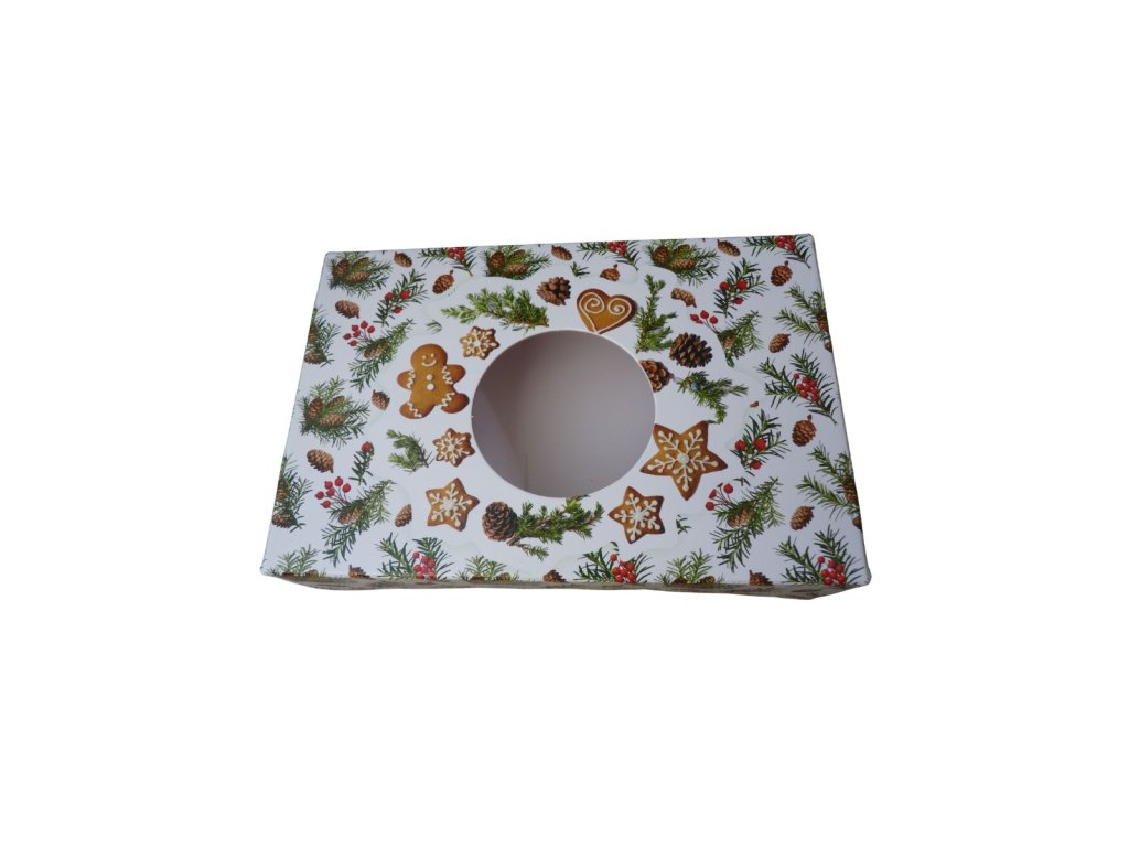 Papírová krabička s průhledným okénkem na cukroví s vánočním motivem.