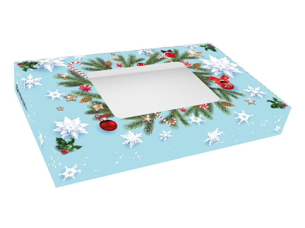 Papírová krabička s průhledným okénkem na cukroví s vánočním motivem.