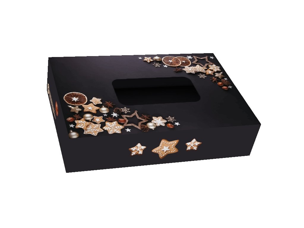 Papírová krabička s průhledným okénkem na cukroví s vánočním motivem.
