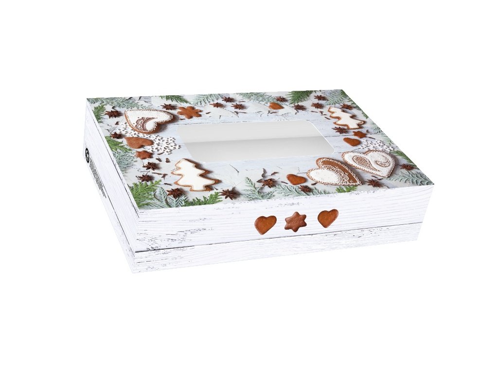 Papírová krabička s průhledným okénkem na cukroví s vánočním motivem.