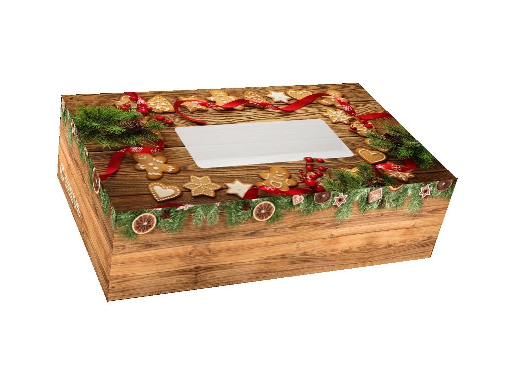 Papírová krabička s průhledným okénkem na cukroví s vánočním motivem.