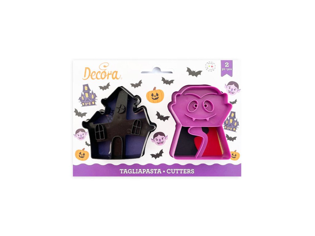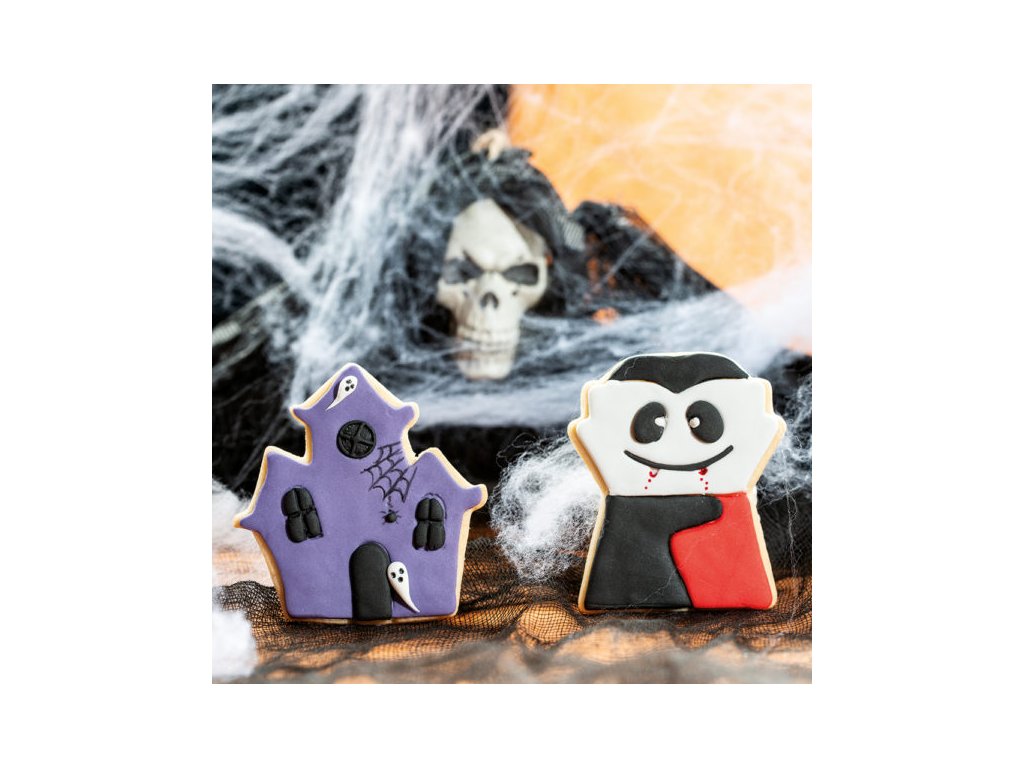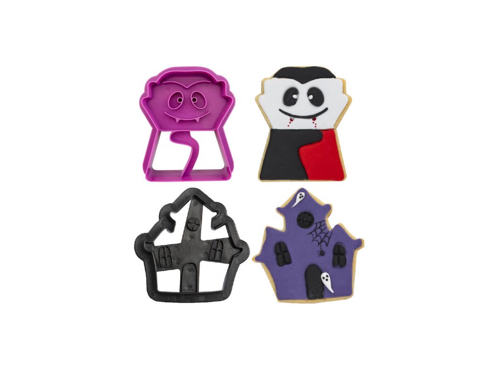 Sada dvou plastových vykrajovátek s motivem upíra a strašidelného domu.