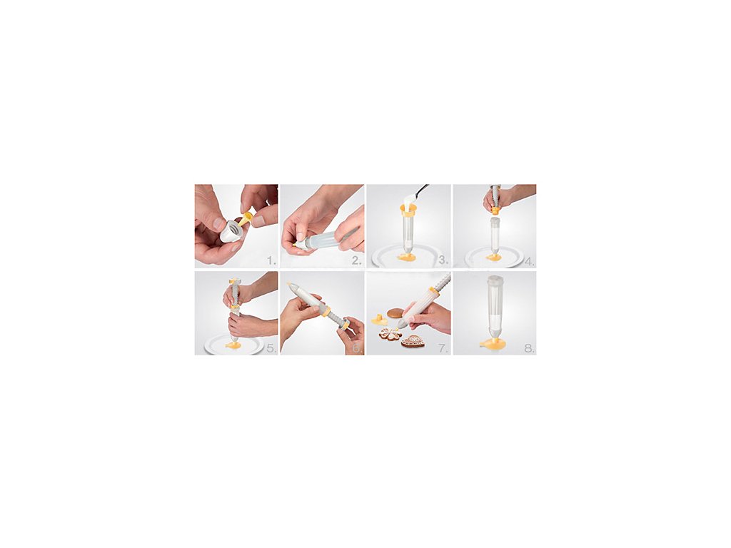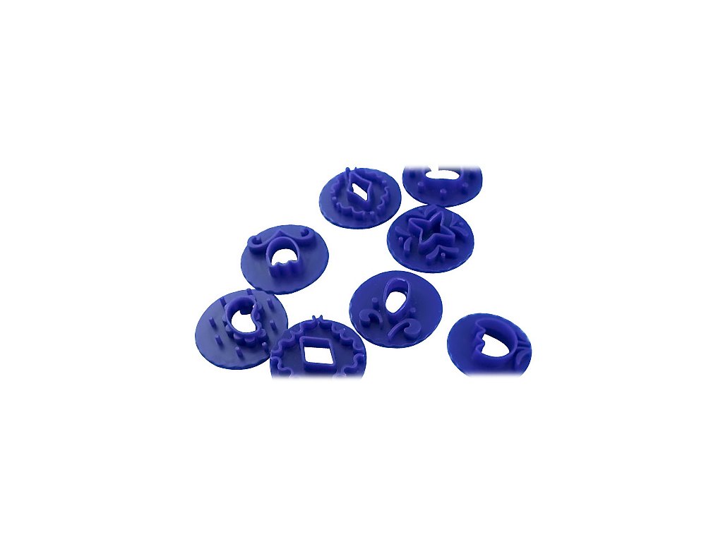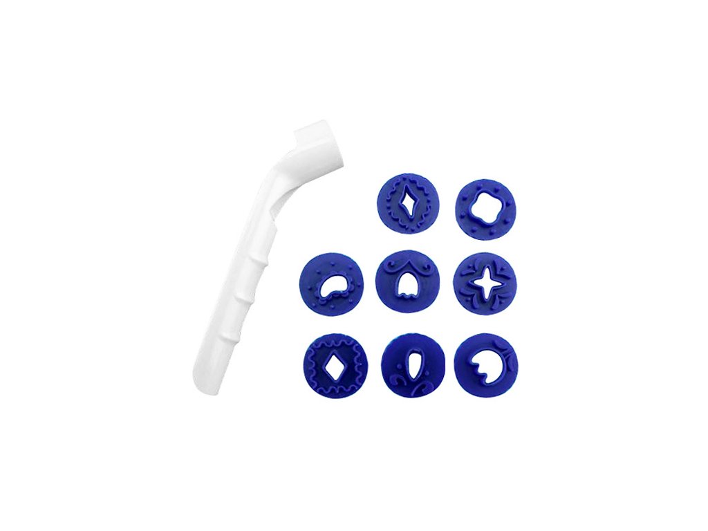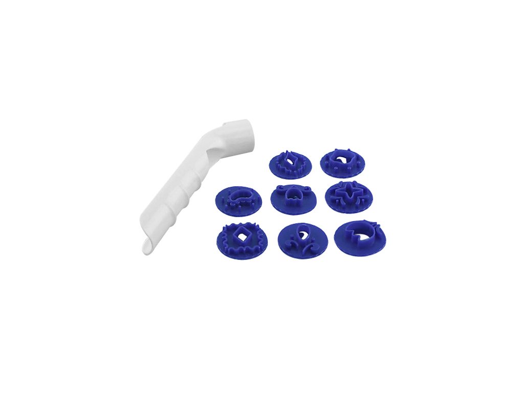 Dekorační nástroj obsahující 8 vyměnitelných vykrajovátek a praktickou rukojeť. Vytvořte úžasné dekorace pomocí tohoto snadno použitelného nástroje. Nástavce se velmi snadno vyměňují a lehce vykrojí z fondantu, icingu nebo marcipánu krásné tvary diamantů, květin...