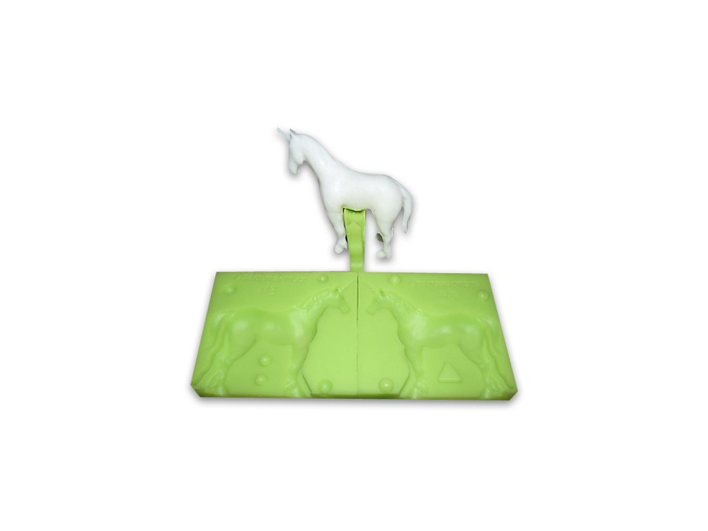 Postup výroby koně: nejdříve naplníme hmotou formičku číslo 1/3, potom naplníme polovinu formičky 3/3 (druhá půlka nohou) a přitiskneme k formičce 1/3. Pak naplníme druhou část formičky 3/3 (druhá půlka nohou). Nakonec naplníme formičku 2/3 a vše k sobě přitiskneme. Pro lepší spojení všech části můžete formičky zatížit nebo převázat.