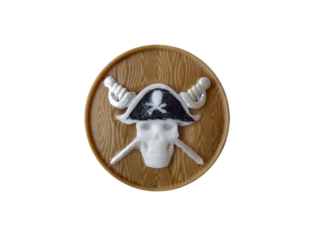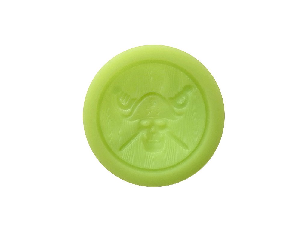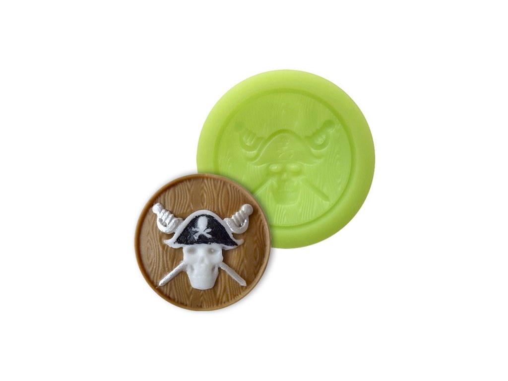 Silikonová formička s obrázkem pirátské hlavy a dvou šavlí na dřevěném podkladě.