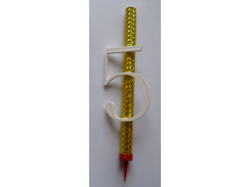 Fontána na dort ve zlaté barvě s číslicí - 5. Číslice je vyrobena z bílého plastu.