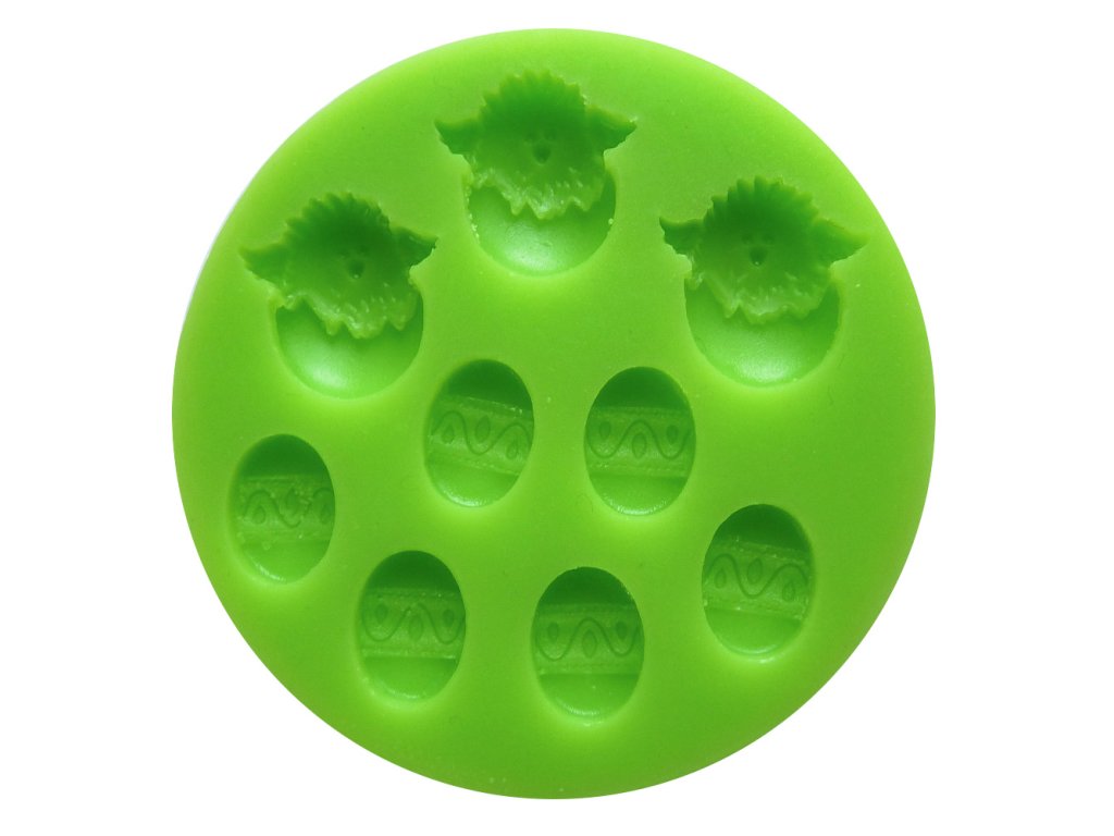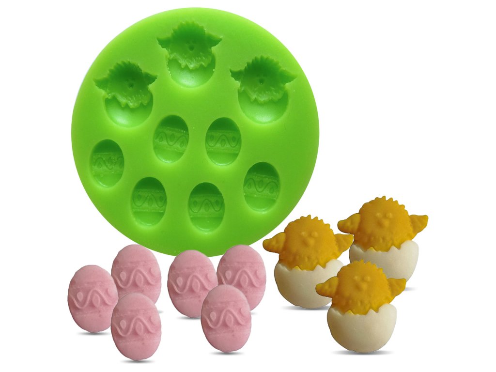 Silikonová formička s motivem kuřátek a vajíček.