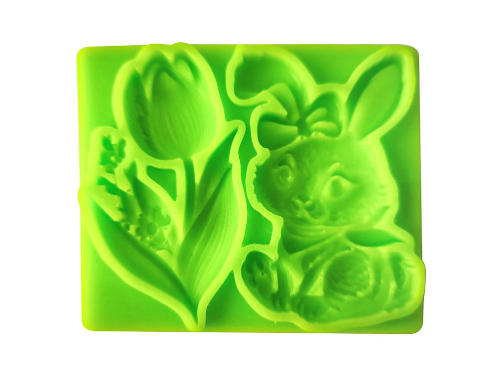 Silikonová formička s motivem zajíčka a tulipánu.