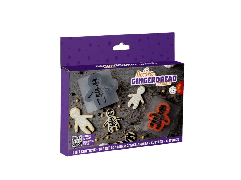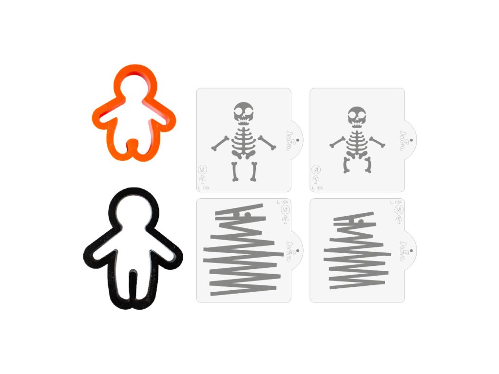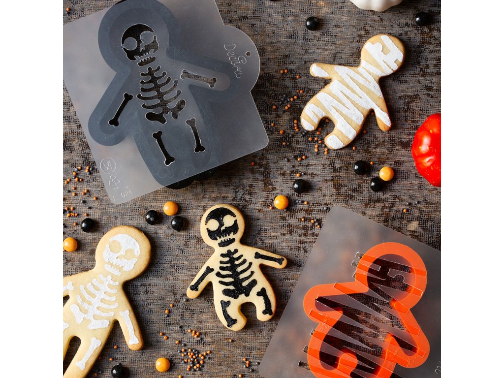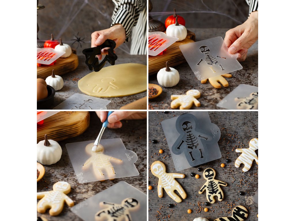 Sada plastových vykrajovátek a šablon kostlivec. Na šablonu lze použít cukr, čokoládu nebo královskou glazuru.