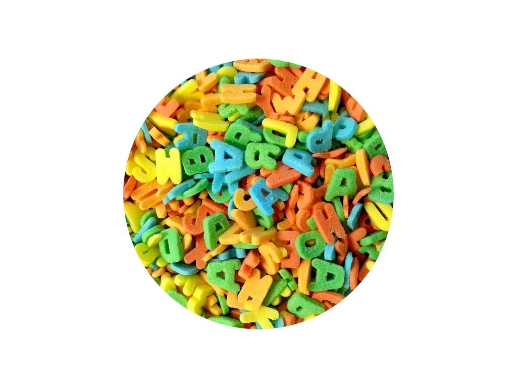 Barevná cukrová písmenka ke zdobení dortů, zákusků a cukroví.