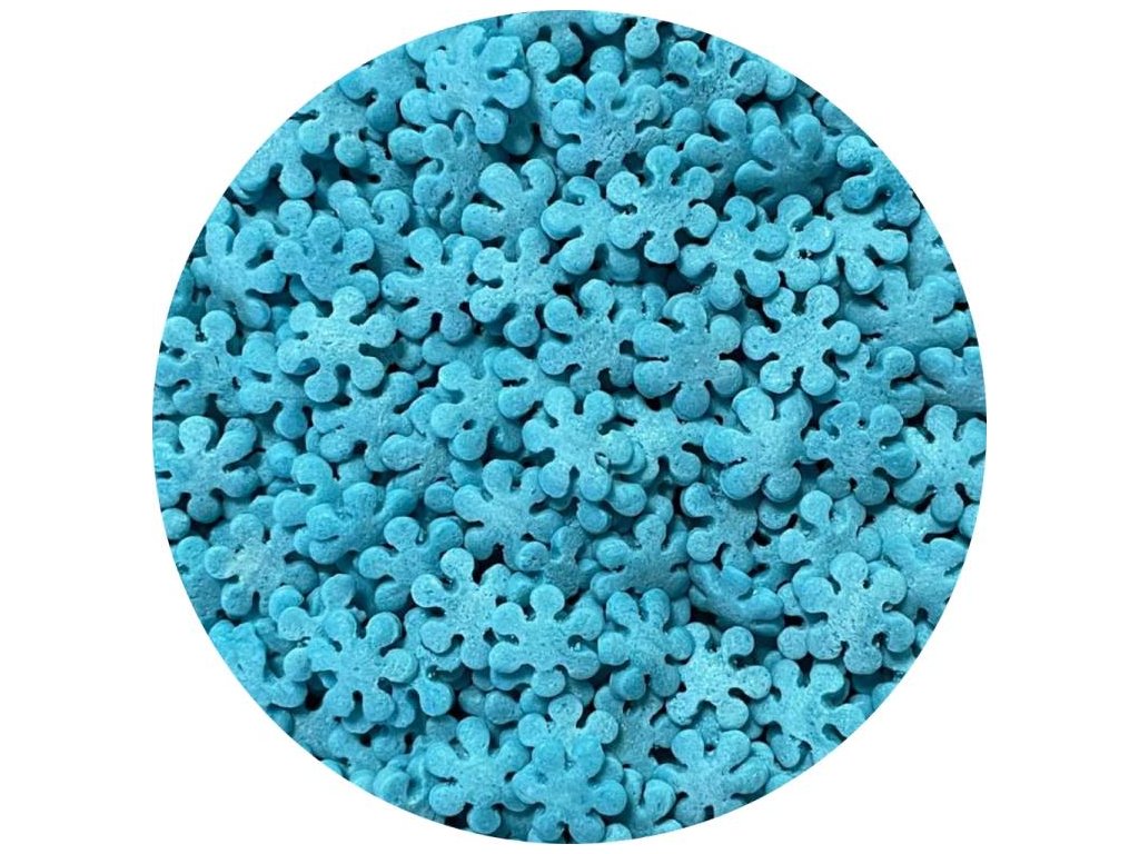 Cukrová dekorace v podobě modrých sněhových vloček.